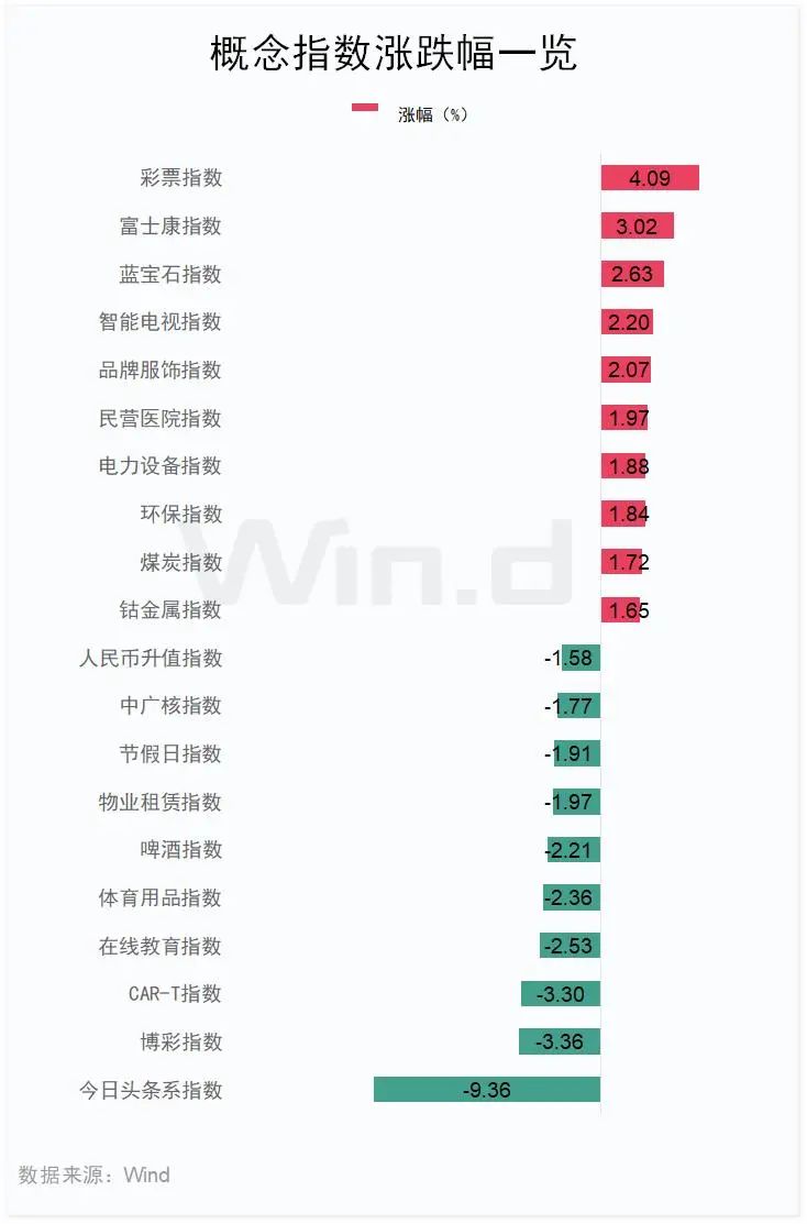 从盘面来看,Wind概念板块涨跌不一。彩票指数领涨4.09%,富士康指数涨3.02%,蓝宝石指数涨2.63%,今日头条系指数跌9.36%,博彩指数跌3.36%,CAR-T指数跌3.3%。