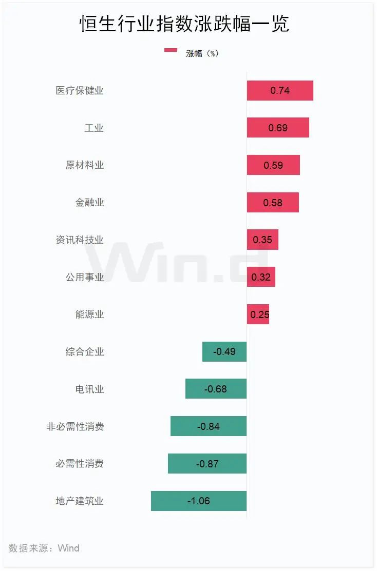 从行业表现看,恒生行业指数日内涨跌不一。医疗保健业指数涨0.74%,工业指数涨0.69%,原材料业指数涨0.59%。跌幅方面,地产建筑业指数跌1.06%,必需性消费指数跌0.87%,非必需性消费指数跌0.84%。