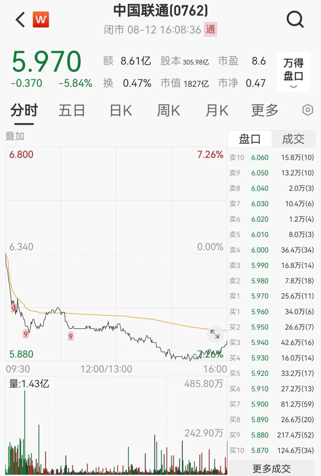 8月9日,中国联通港股开盘急速下跌,午后跌幅一度扩大至7.26%,尾盘跌幅收窄,全天收于5.97港元,跌5.84%。