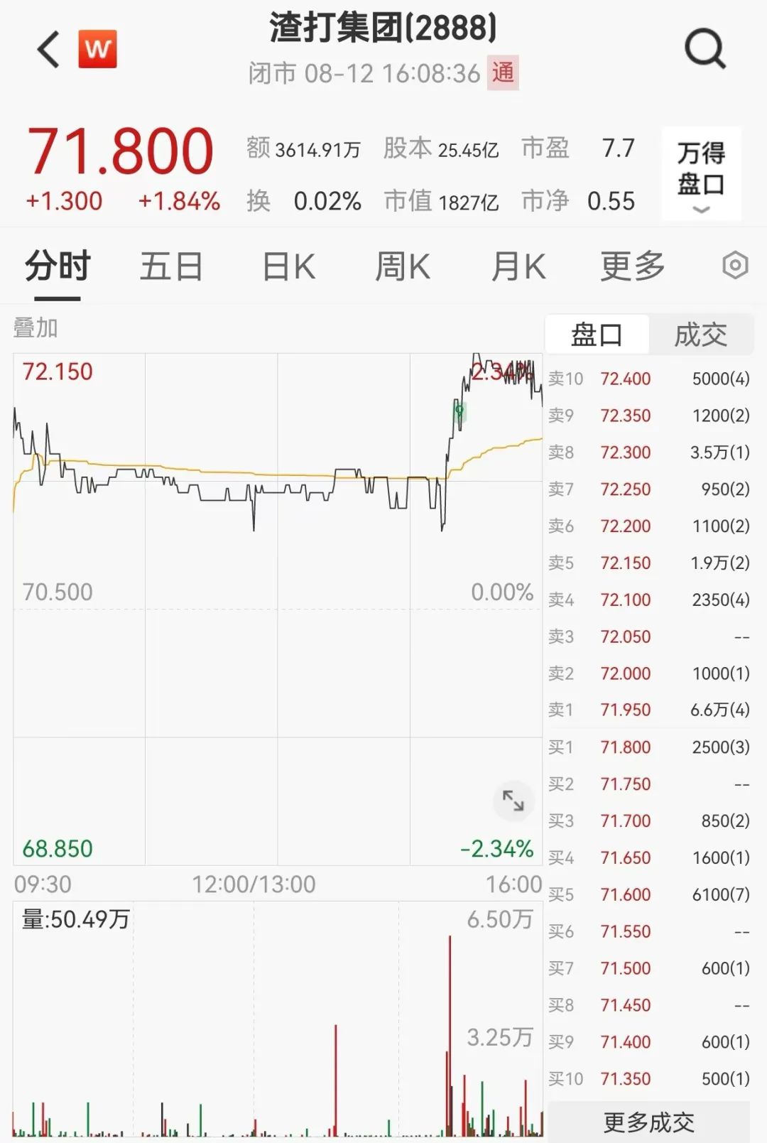此外,渣打集团发布公告,8月9日集团耗资1058.76万英镑回购148.87万股。渣打银行股价尾盘大幅拉升,一度涨2.34%,最终收于71.80港元,涨1.84%。